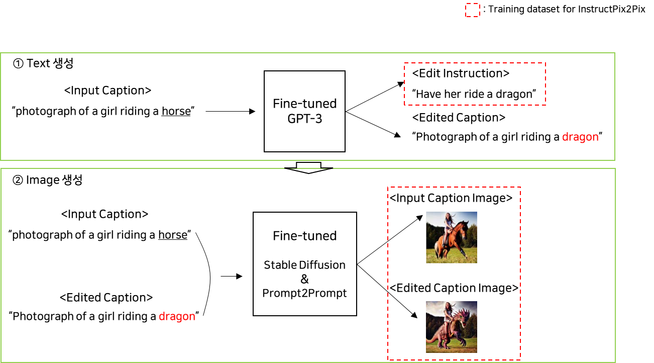 - GPT-3와 Stable Diffusion모델을 사용하여 이미지와 그에 맞는 지시어 그리고 편집된 이미지의 학습데이터를 구축