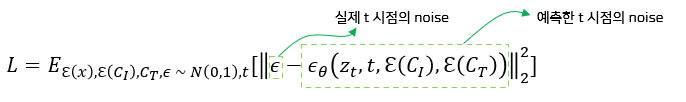 - 수식을 살펴보면, 지시어와 이미지를 모두 반영하여 Noise의 예측에 대한 오차가 최소가 되도록 학습을 한다.