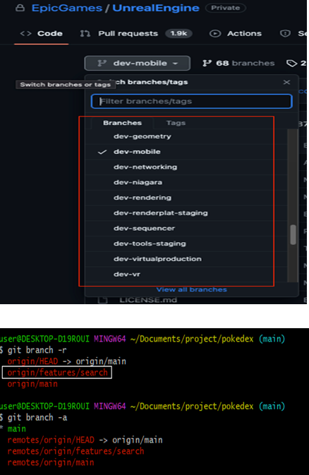 - Unreal Engine의 경우 큰 기능에 대해서 dev-mobile과 같이 branch을 관리한다.
