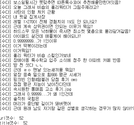 # 크롤링이 성공하면 글 제목을 출력하게 되고,