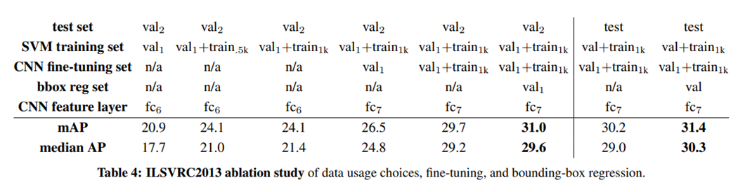 - fc7 Layer 및 Bounding Box regression을 사용한 R-CNN에 Fine-tuning을 적용했을 때, 가장 성능이 우수하다.