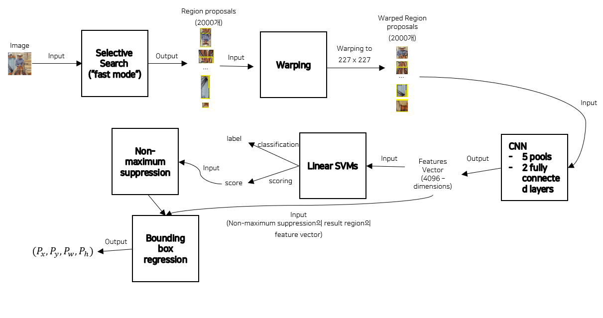 - 해당 이미지는 R-CNN의 전체 프로세스를 요약한 그림이다.