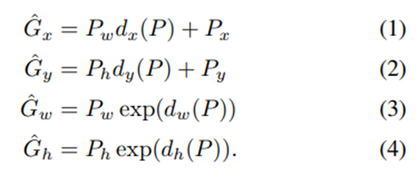 - 여기서 dx(P), dy(P)는 선형함수, dw(P), dh(P)는 로그함수를 사용하였는데 이는 dw(P), dh(P)의 값이 너무 커지는 것을 방지하기 위함이다.