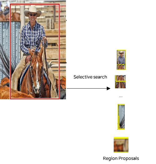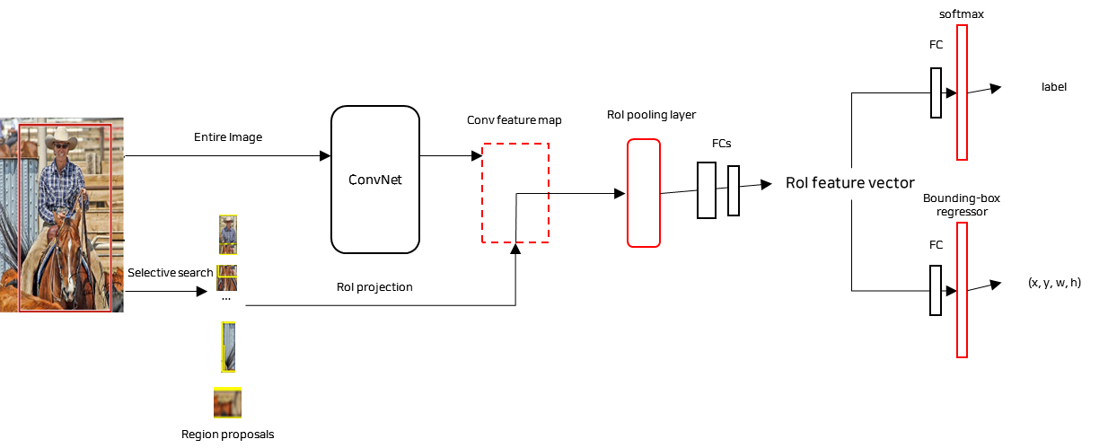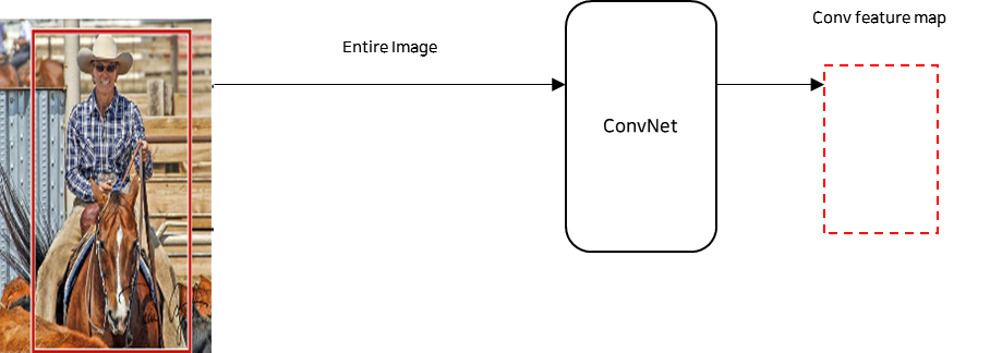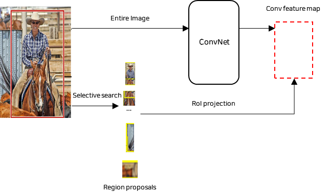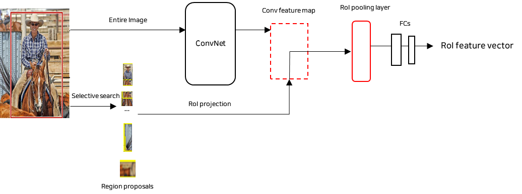 - Selective Search로 추출된 Region proposals을 convolution feature map에 ROI projection을 하여 convolution feature map 상에서 관심영역을 지정한다.