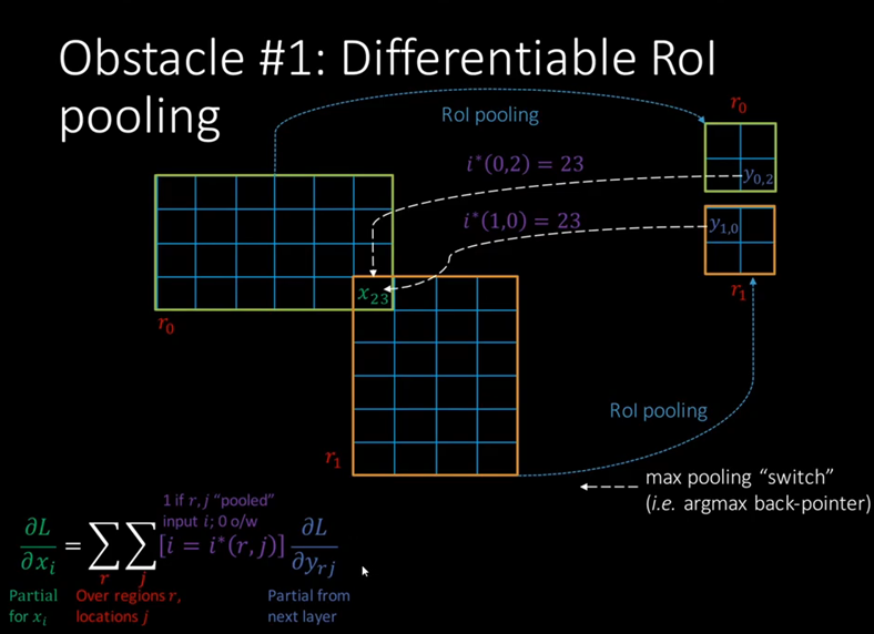 - ROI pooling layer에 대한 오차역전파는 pooling 전의 일치하는 cell에 대해서만 오차역전파를 진행한다.