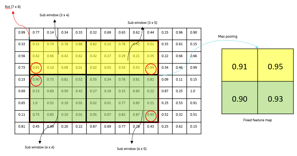 - h/H = 3.5, w/W = 4.5이므로, {(4x4), (4x5), (3x4), (3x5)}의 sub window을 구성하여 max pooling을 진행한다.