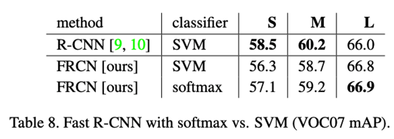 - Fast R-CNN 구조에서는 softmax을 사용하는 것이 성능이 약간 우세하나, 별 차이가 없다.