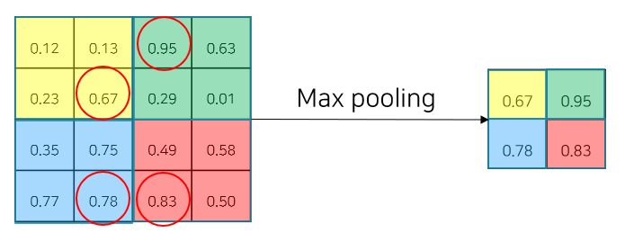 - 사용자가 설정한 크기와 간격만큼 window을 이동시키면서 해당 window 영역의 픽셀 중 최댓값만 고르는 pooling 방법의 일종