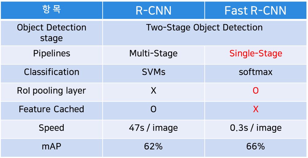 - Fast R-CNN에서는 두 개의 Sibling output layers에 대해서 Multi-Task Loss function을 구성하여 Single-Stage pipeline을 구성하였다.