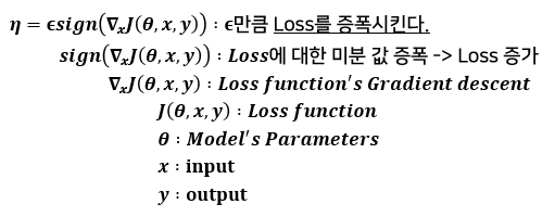 - 즉, Output에 대한 Loss을 증폭시키는 Adversarial Perturbation을 생성한다.