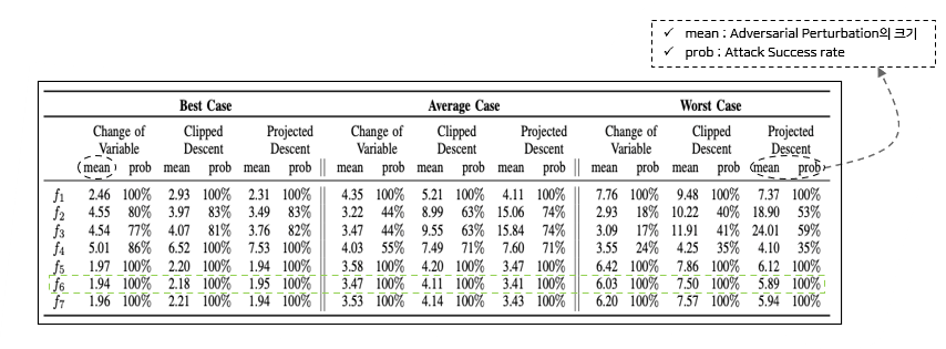 Attack Success rate가 100%이 아닌 f function에 대해서는 성공한 경우의 Perturbation에 대해서만 계산