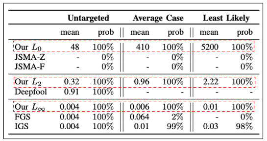 L0, L2 Attack을 사용하면 기존의 Attack보다 더 작은 Perturbation을 생성한다.