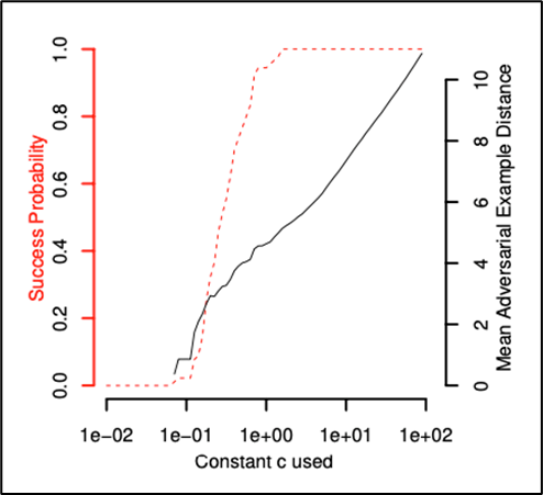 C&W Attack에서 clean image와 adversarial image의 distance와 Attack success prob은 trade-off 관계가 있다.