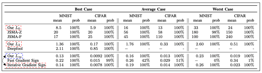각각의 Distance metrics로 만들어지는 Adversarial Examples은 서로 다르며, 각 Distance metrics로 생성된 Adversarial Examples마다 장단점이 존재한다.