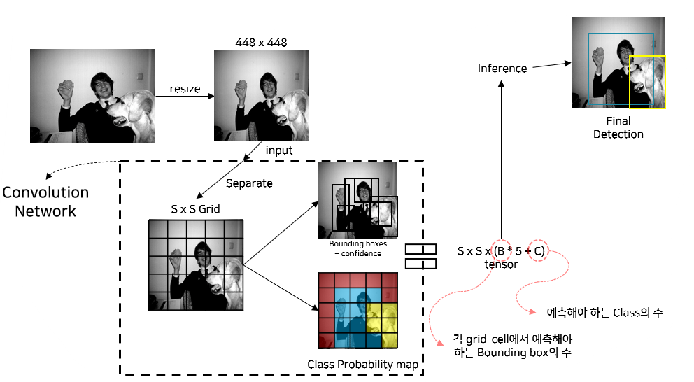 - 각 grid-cell은 B개의 box predicter가 존재하고, box predicter는 (x, y, w, h) + confidence를 예측