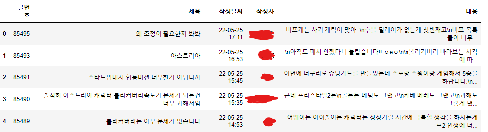 df = pd.DataFrame({'글번호' : content_num_list, '제목' : title_list, '작성날짜' : content_date_list, '작성자' : content_writer_list