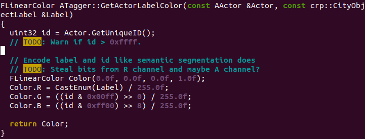 CARLA에서는 Instance Segmentation은 제공하지만 생성되는 객체에 대한 RGB 정보는 제공하지 않는다. 따라서 CARLA Unreal의 코드 수정을 통해서 RGB 정보를 얻고 객체를 구분할 수 있다.