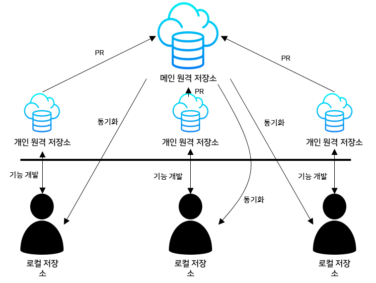 개인은 개인 원격 저장소를 통해 개발을 진행하고 메인 원격 저장소로 PR을 보내면 프로젝트 관리자의 판단하에 병합